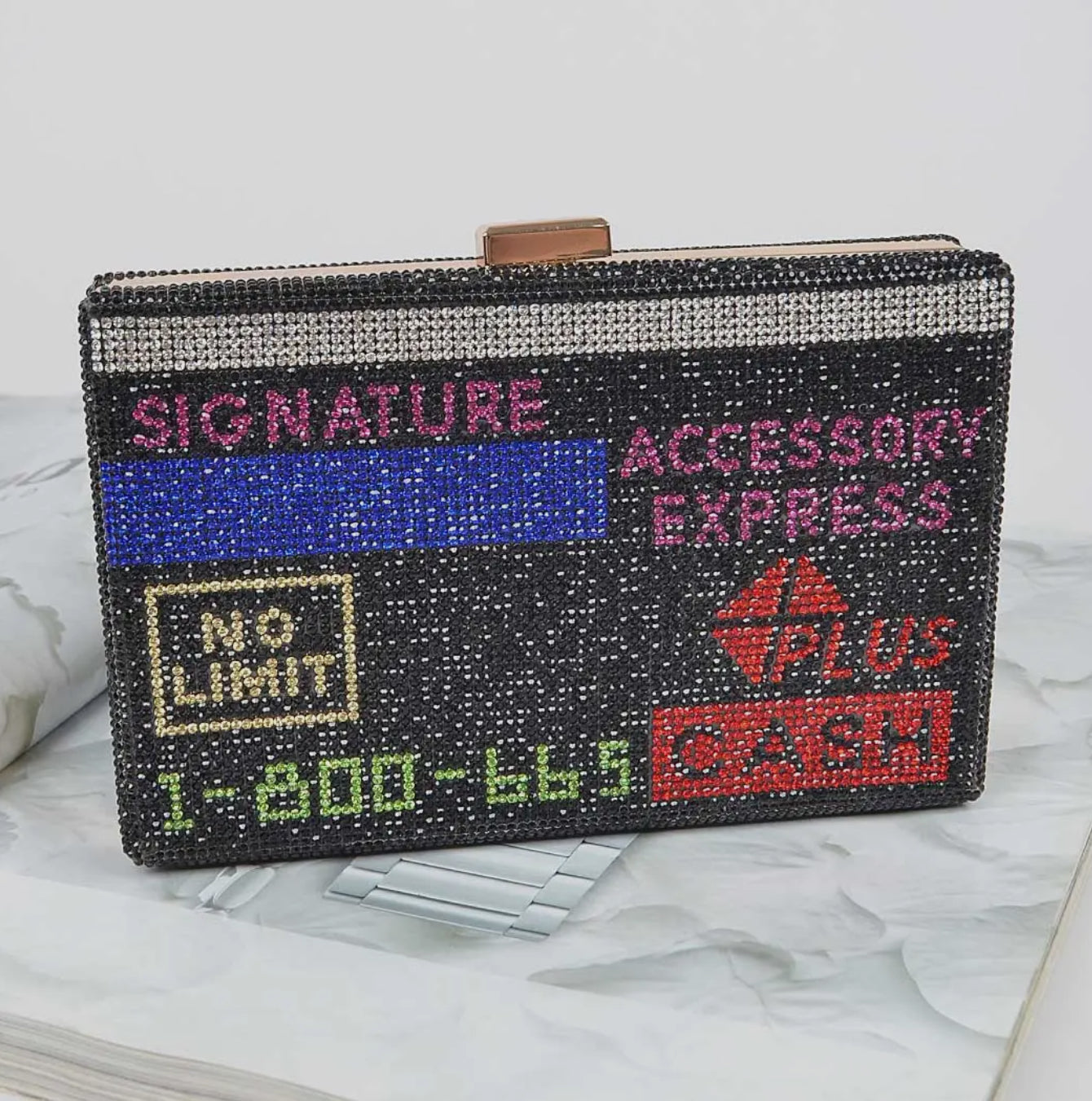 Sparkle and shine with our Accessory Express Clutch! This fully rhinestoned clutch features a unique credit card design, giving you unlimited style and convenience. And with a removable chain strap, you can wear it as a clutch or a crossbody, making it the perfect accessory for any occasion. Time to add some credit to your life!