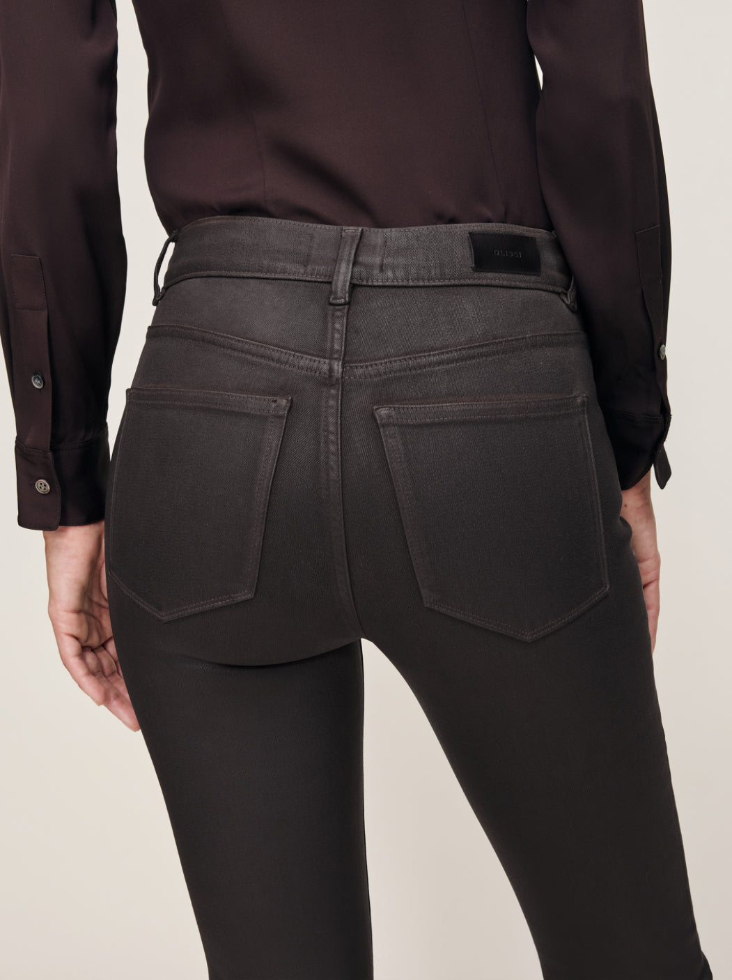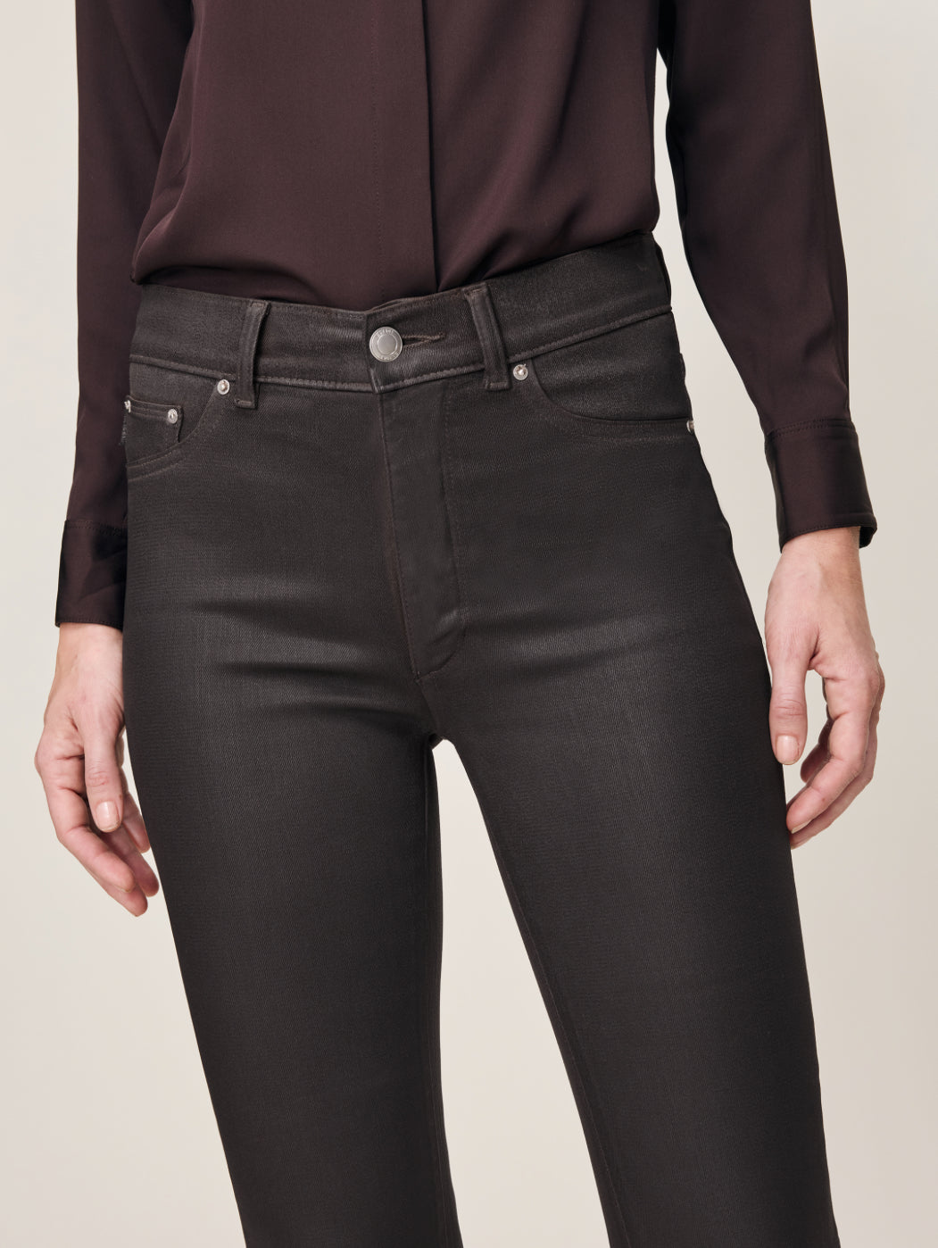 Introducing the Bridget Boot High Rise Instasculpt jeans from DL1961. These iconic jeans come in a sleek coated chocolate or black color, perfect for the fall season. With a flattering high rise fit, you'll feel confident and stylish every time you slip them on. Elevate your denim game with the Bridget Boot jeans.