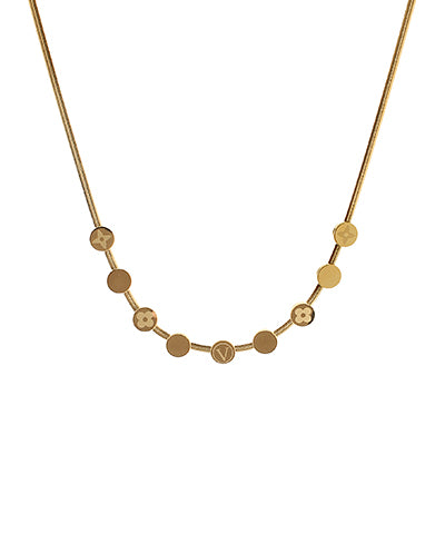 Simple yet elegant, this Disk Clover Chain Necklace features a playful circle disk adorned with delicate clovers on a gold chain. Perfect for any occasion, add a touch of fun and sophistication to your outfit.