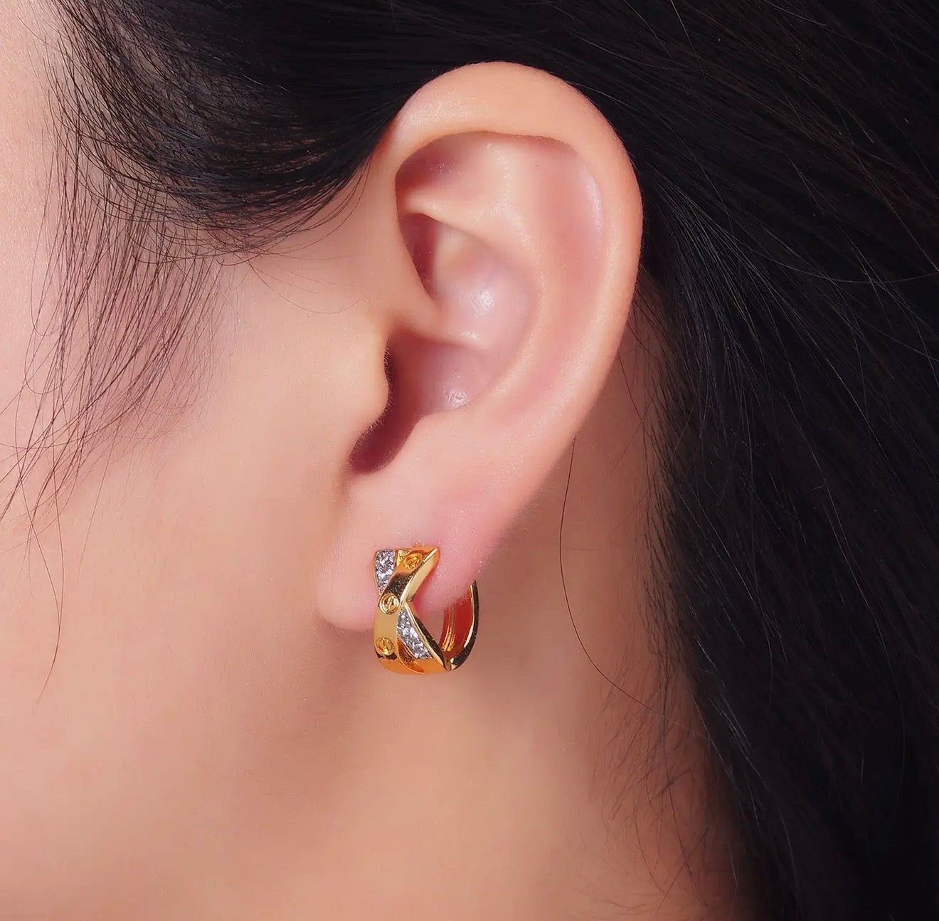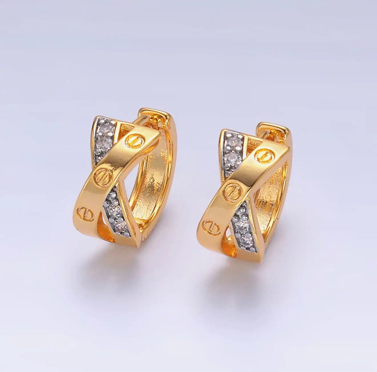 Elevate your style with the Sutton Two Toned Huggies! Crafted from 24k gold filled material, these earrings feature a stunning two-toned design adorned with delicate micro crystals and a chic nail head detail. Perfect for adding a touch of elegance to any outfit, they are a must-have accessory for the fashion-forward!