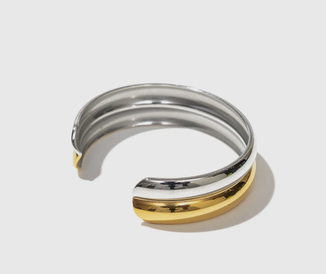 This Twin Tone Cuff is a stainless steel, waterproof bracelet that combines a mix of gold and silver tones. With its dual tone design, this cuff is a versatile accessory that is both stylish and functional. Enjoy its durability and trendy look.