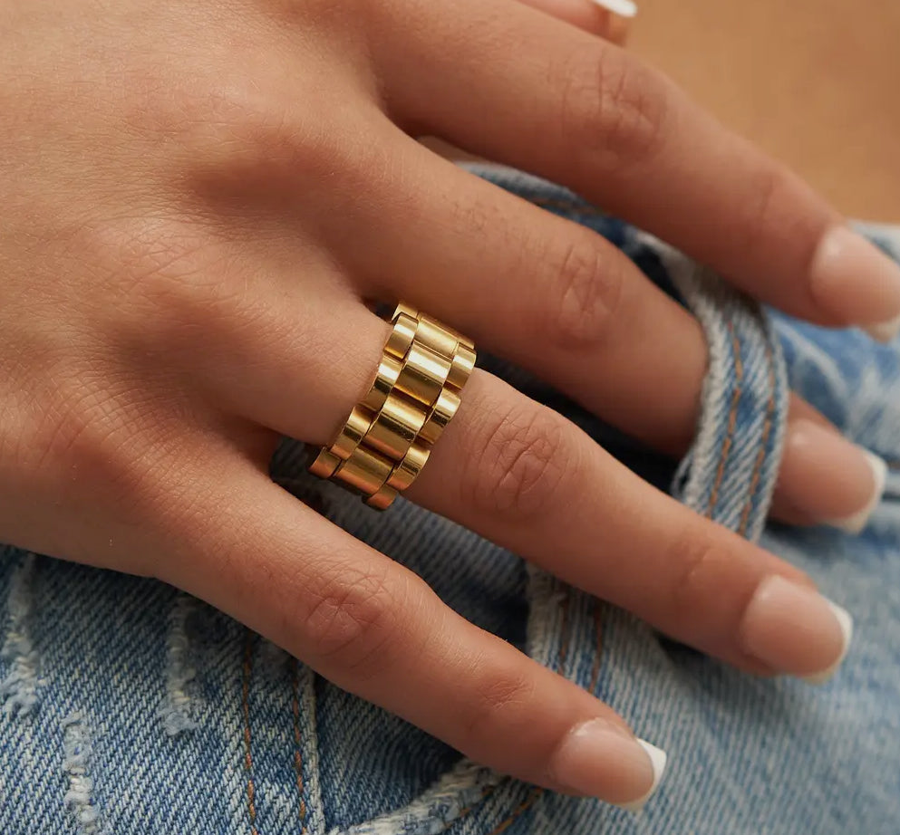 Upgrade your watch game with our Waterproof Gold Watch Band Ring. Made with precision and high-quality materials, this ring adds a touch of glamour to your everyday look. Never worry about water damage, this ring is completely waterproof. Elevate your style and stay on top of your busy schedule with this functional and stylish accessory. Size 7